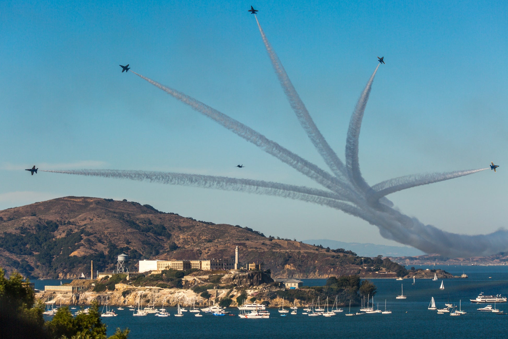 High quality 24x36" print of the Blue Angels flying in formation over Angel Island for Fleet Week.